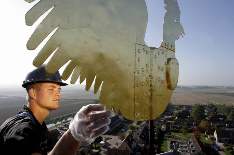 Hessel van der Goot van Bouwbedrijf De Jong uit Workum ,,draait de haan in'', nadat hij het 15 kilo wegende gevaarte geplaatst heeft op de ruim 30 meter hoge toren van de hervormde kerk in Arum. Het opknappen van het beest maakte deel uit van een grondige opknapbeurt van de toren. Om aantasting van de bladgoudlaag te voorkomen heeft Van der Goot plastic handschoenen aangetrokken. LC Arum 2005