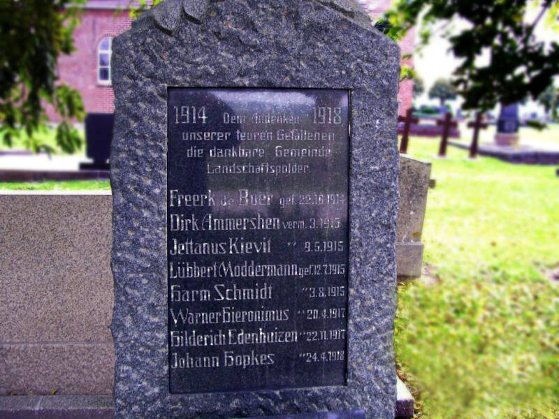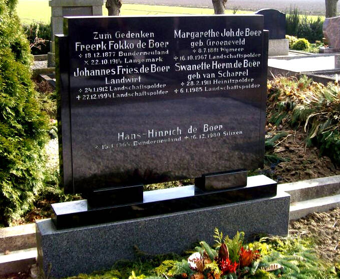 Niet alleen de dorpsnamen hebben iets vertrouwds, dat geldt ook voor de namen van de vroegere bewoners. Neem nu iemand als Freerk de Boer, geboren in 1877 in Bunderneuland. Hij zou niet oud worden want hij sneuvelde als 36-jarige soldaat in de Eerste Wereldoorlog. Hij liet zijn vrouw en dochter van 3 en een zoon van 2 jaar achter. De naam De Boer kwam ook in het Rheiderland veelvuldig voor. De voertaal in dat gebied was in de negentiende eeuw nog overwegend Nederlands of in ieder geval een dialectische variant daarvan. Later is door de Duitse invloedssfeer de schrijfwijze van De Boer in enkele families gewijzigd in De Buhr, zo blijkt uit opschriften op grafstenen op het kerkhof in Landschaftspolder.